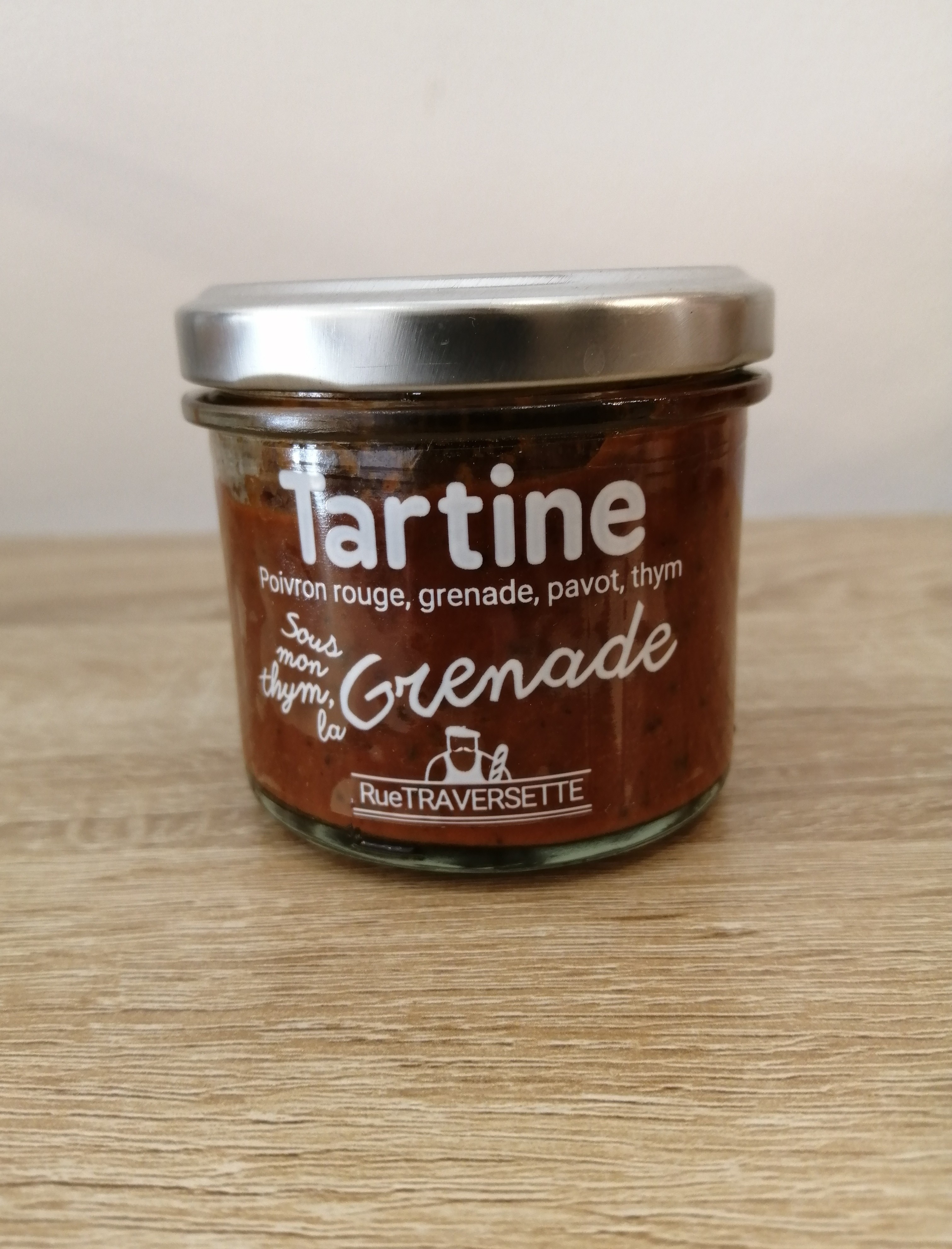 Rue Traversette est situé dans l'Hérault et vous propose de délicieux tartinables végétaux cuisinés sans ajout de conservateur, additif, colorant. La gamme "Franchouillarde"allie saveur et humour dans l'intitulé de ces tartinables. Sous mon thym la Grenade vous rappellera une célèbre chanson.. A base de poivron rouge et de grenade, elle se déguste à l'apéro sur du pain, accompagne les fromages frais.