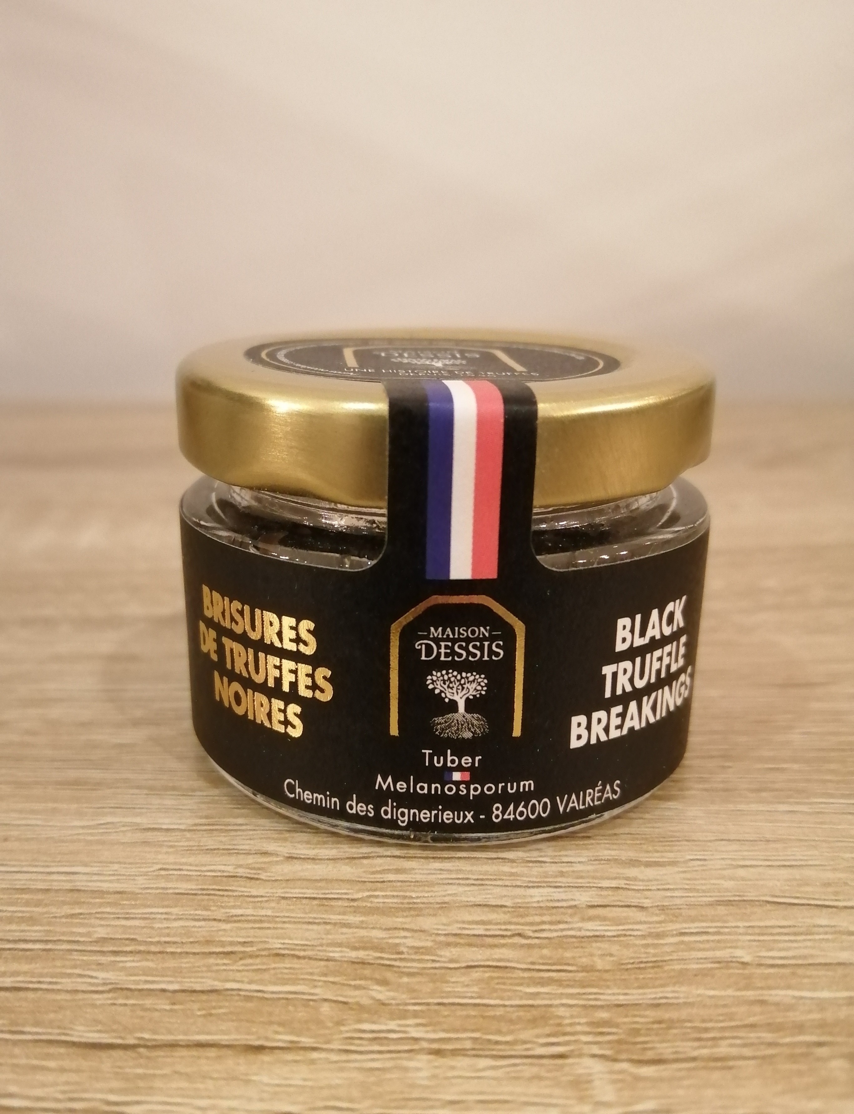 La maison Dessis implantée dans le Vaucluse, au coeur de l'enclave des papes est spécialisée dans le négoce des truffes depuis 1950, ces brisures de truffes noires sont délicatement hachées afin de faire ressortir tout son parfum, idéal dans un écrasé de pomme de terre, un risotto, des pâtes fraîches, une omelette.