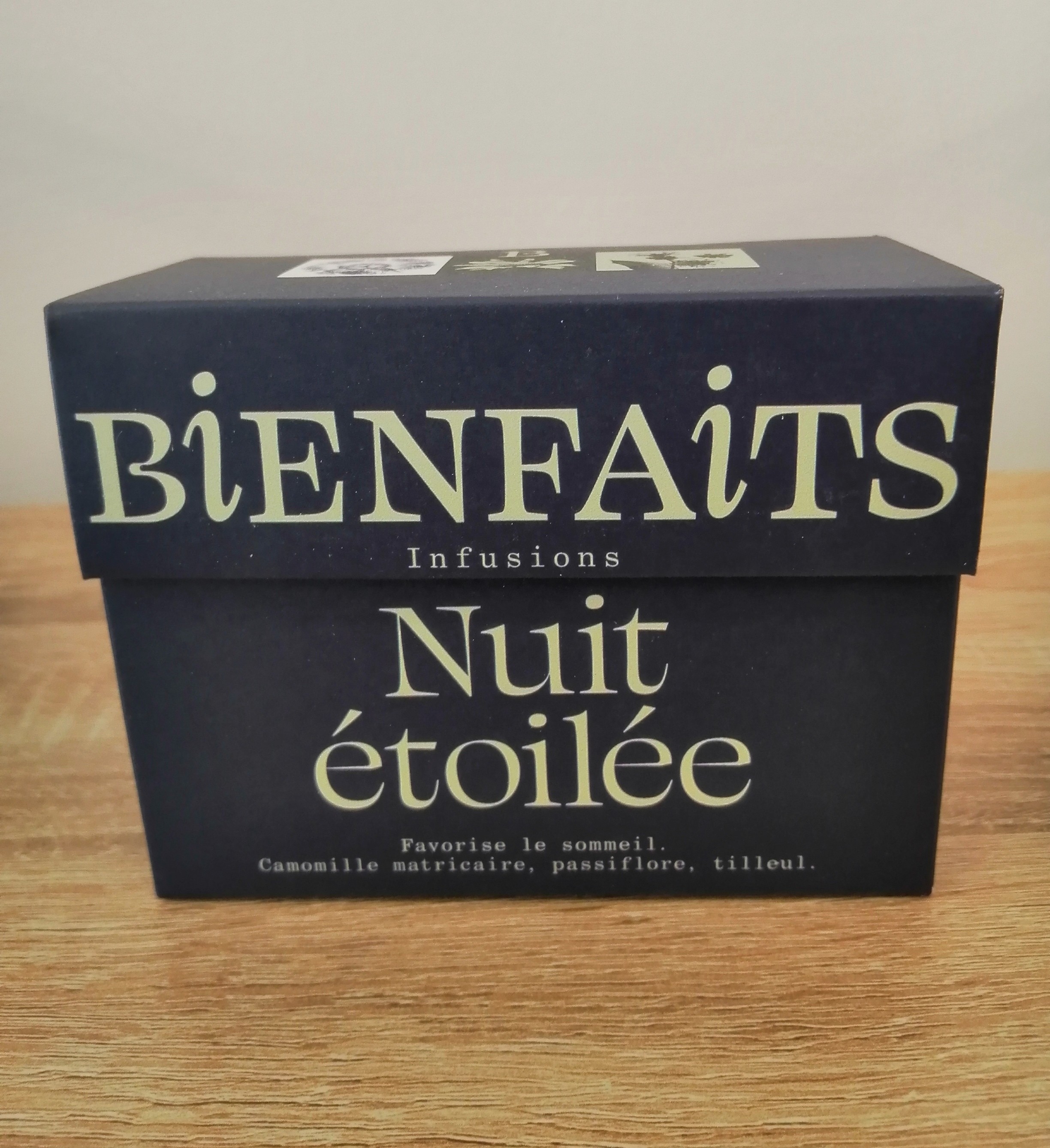 Bienfaits propose des infusions bio à partir de leurs plantes qui sont séchées naturellement durant plusieurs jours afin de préserver leur densité et leur bienfait, aucun arôme, elles ont naturellement beaucoup de goût, un seul sachet suffit dans une théière !