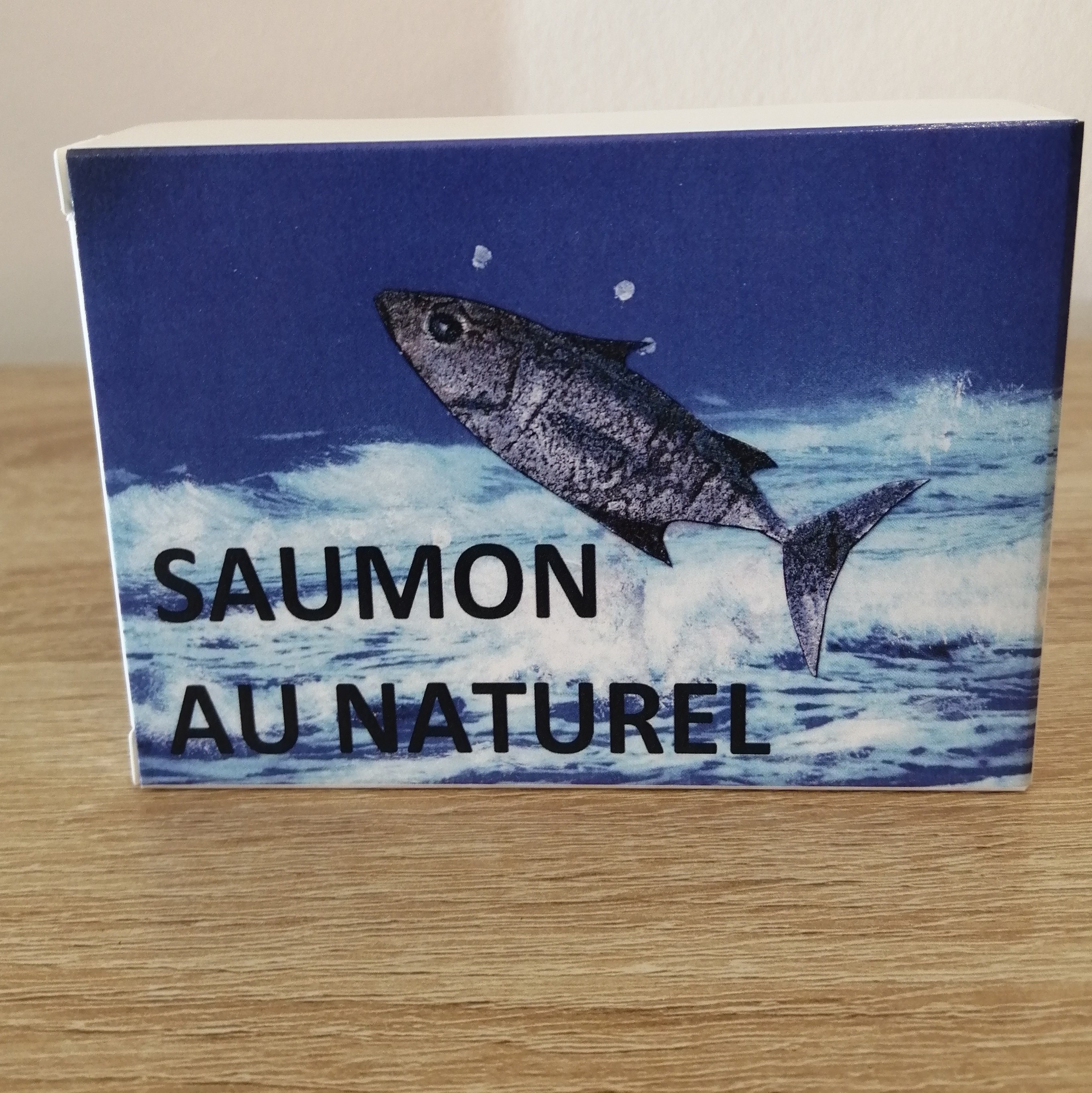 Capitaine Nat' basée dans les Pyrénées propose des conserves de poisson issues d'une pêche responsable, préparées à la main et mises sur grilles pour une cuisson à la vapeur qui les rend plus digestes (pêche de Méditerranée et Atlantique nord-est. Étui carton collector peinture réalisée par Maya François. Ce saumon est sauvage.