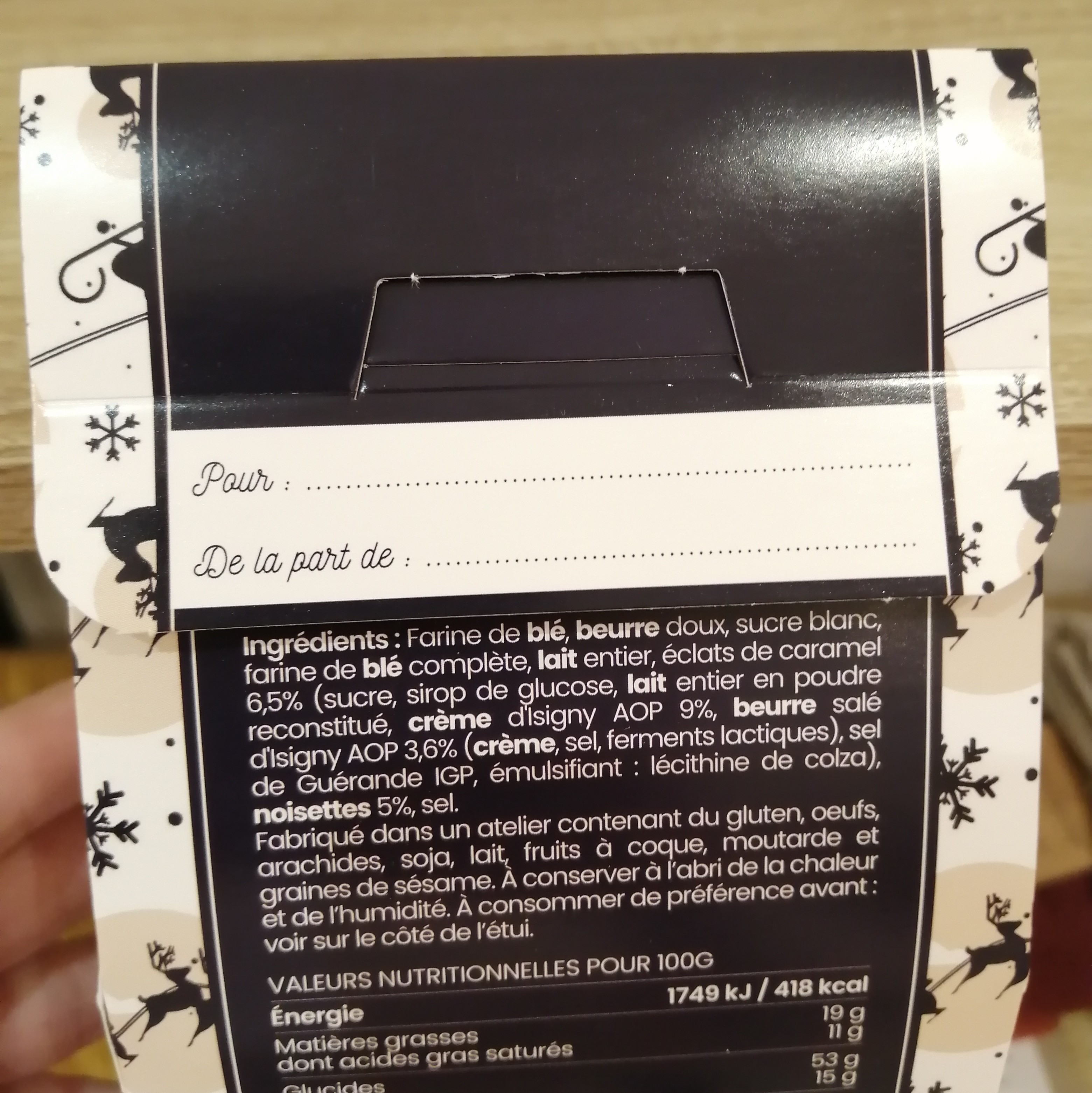 Farine de blé, beurre doux, sucre blanc, farine de blé complète, lait entier, éclats de caramel 6,5% (sucre, sirop de glucose, lait entier en poudre reconstitué, crème d'Isigny A.O.P 9%, beurre salé d'Isigny A.O.P 3,6% (crème, sel, ferments lactiques), sel de Guérande IGP, émulsifiant : lécithine de colza), noisettes 5%, sel.