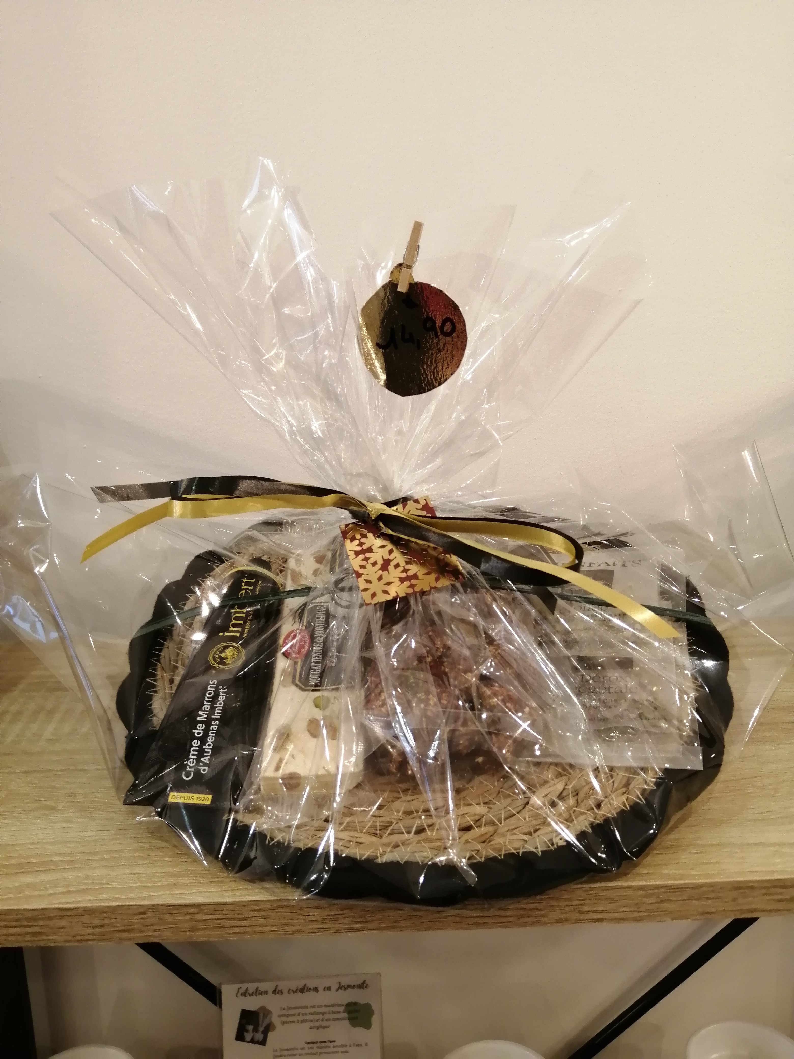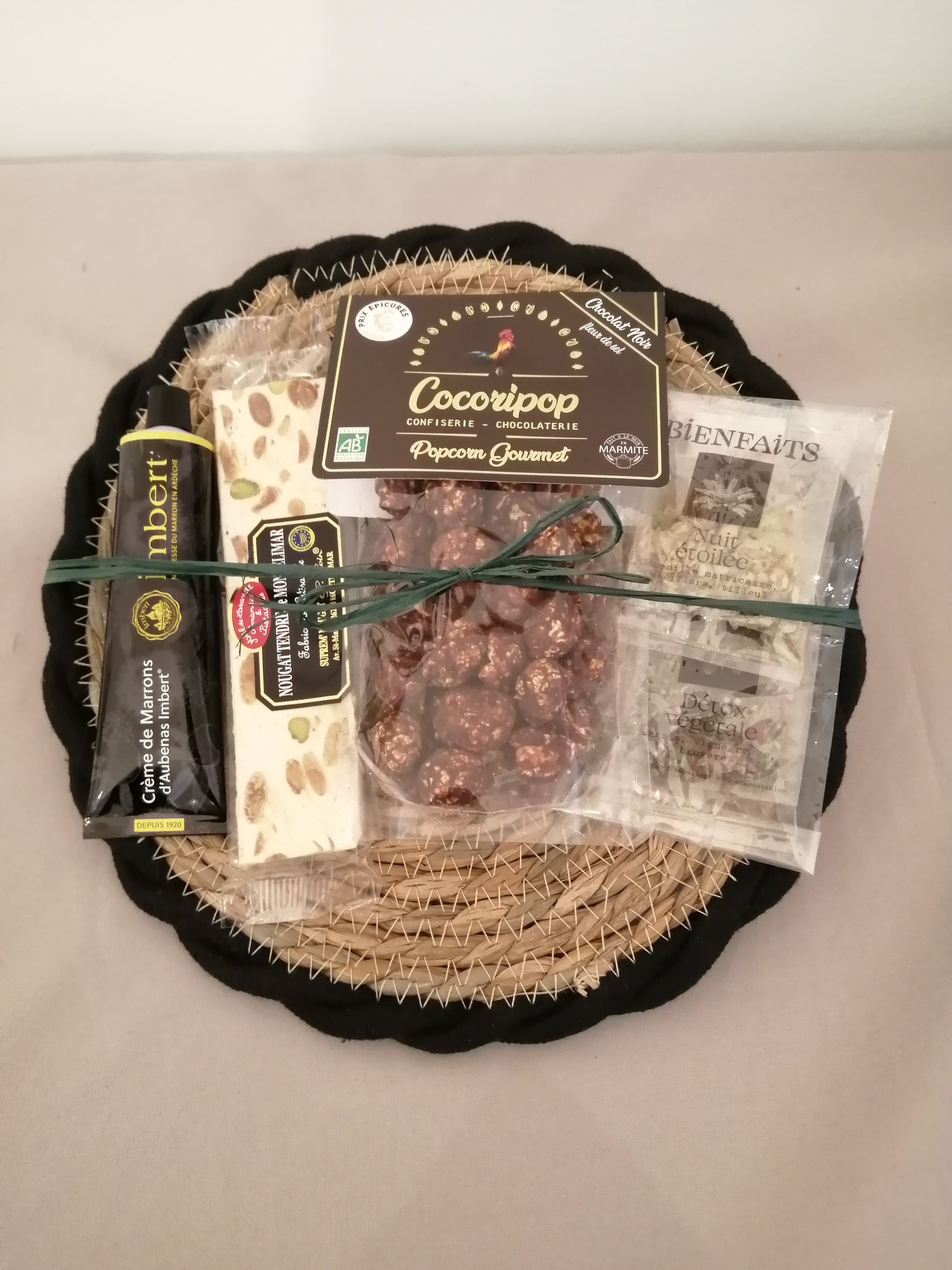 Coffret 4 produits avec 1 tube de crème de marron, 1 sachet de pop corn cacao bio Cocoripop 40 g, 1 barre de nougat amande pistache 50 g, 2 sachets d'infusion bio sur un set tressé naturel
