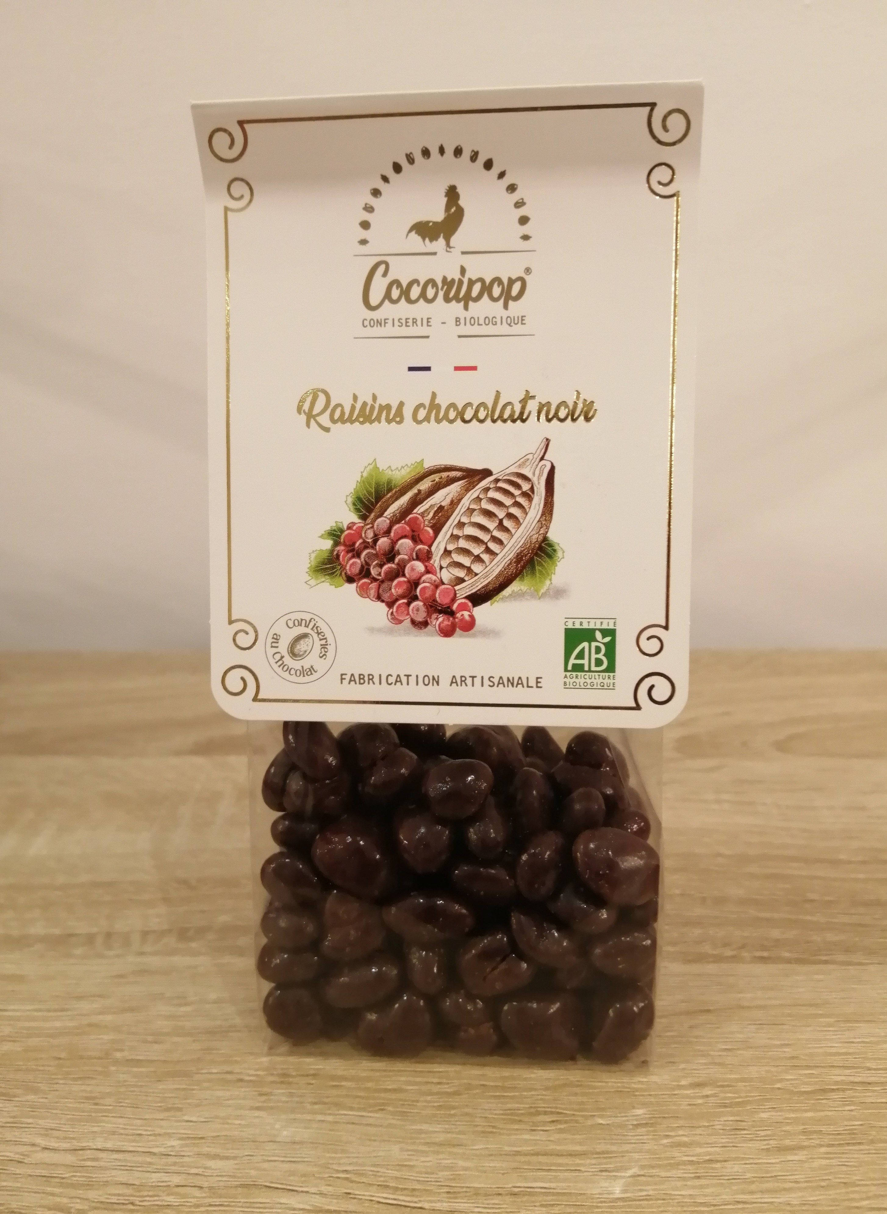 Chocolat noir issu du commerce équitable : 55 % (cacao minimum 63 %), pâte de cacao, sucre, beurre de cacao, poudre de vanille, raisins secs : 45 %, mélange de gomme d'acacia (sucre blond de canne, miel, fibre d'acacia).