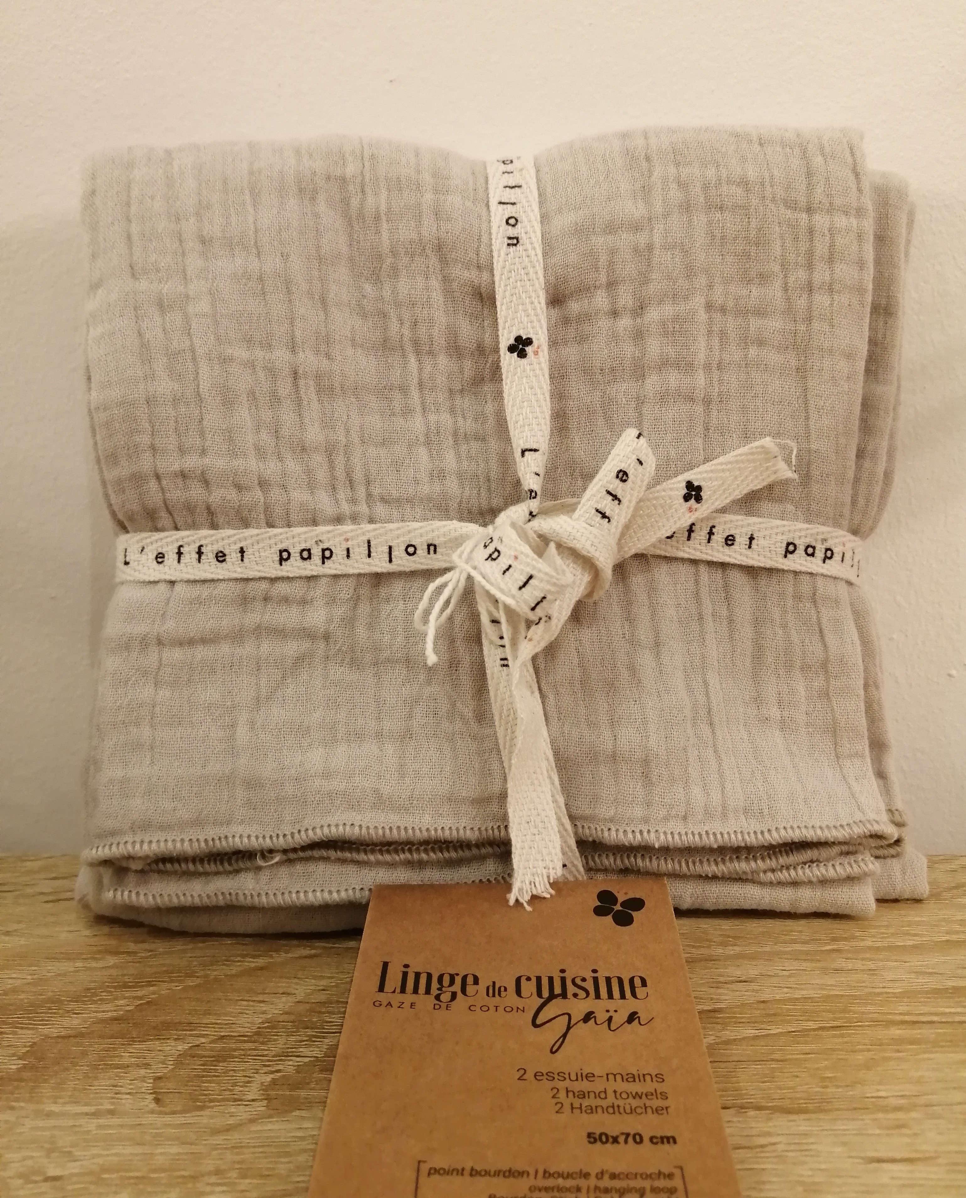 L'effet papillon imagine du linge de maison de qualité, actuel, tout en ayant un partenariat équitable, certifié Oeko tex, réalisé en double gaze de coton indien, tissé en 125g/mm2, ce lot de 2 essuie mains au tissu très agréable et léger apportera une touche tendance à votre cuisine. Modèle Gaia. Dimensions : 50 x 70 cm