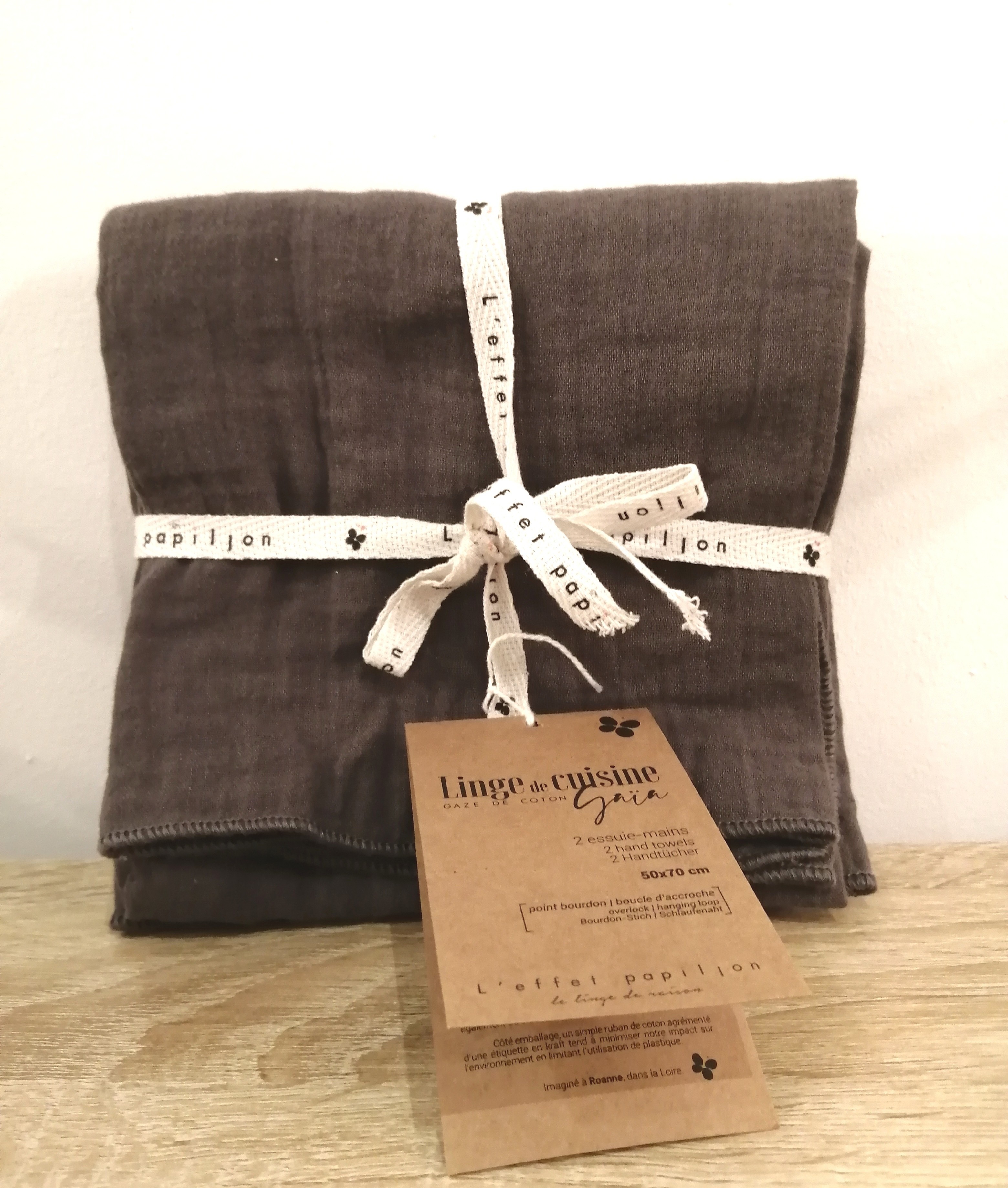 L'effet papillon imagine du linge de maison de qualité, actuel, tout en ayant un partenariat équitable, certifié Oeko tex, réalisé en double gaze de coton indien, tissé en 125g/mm2, ce lot de 2 essuie mains au tissu très agréable et léger apportera une touche tendance à votre cuisine. Modèle Gaia. Dimensions : 50 x 70 cm
