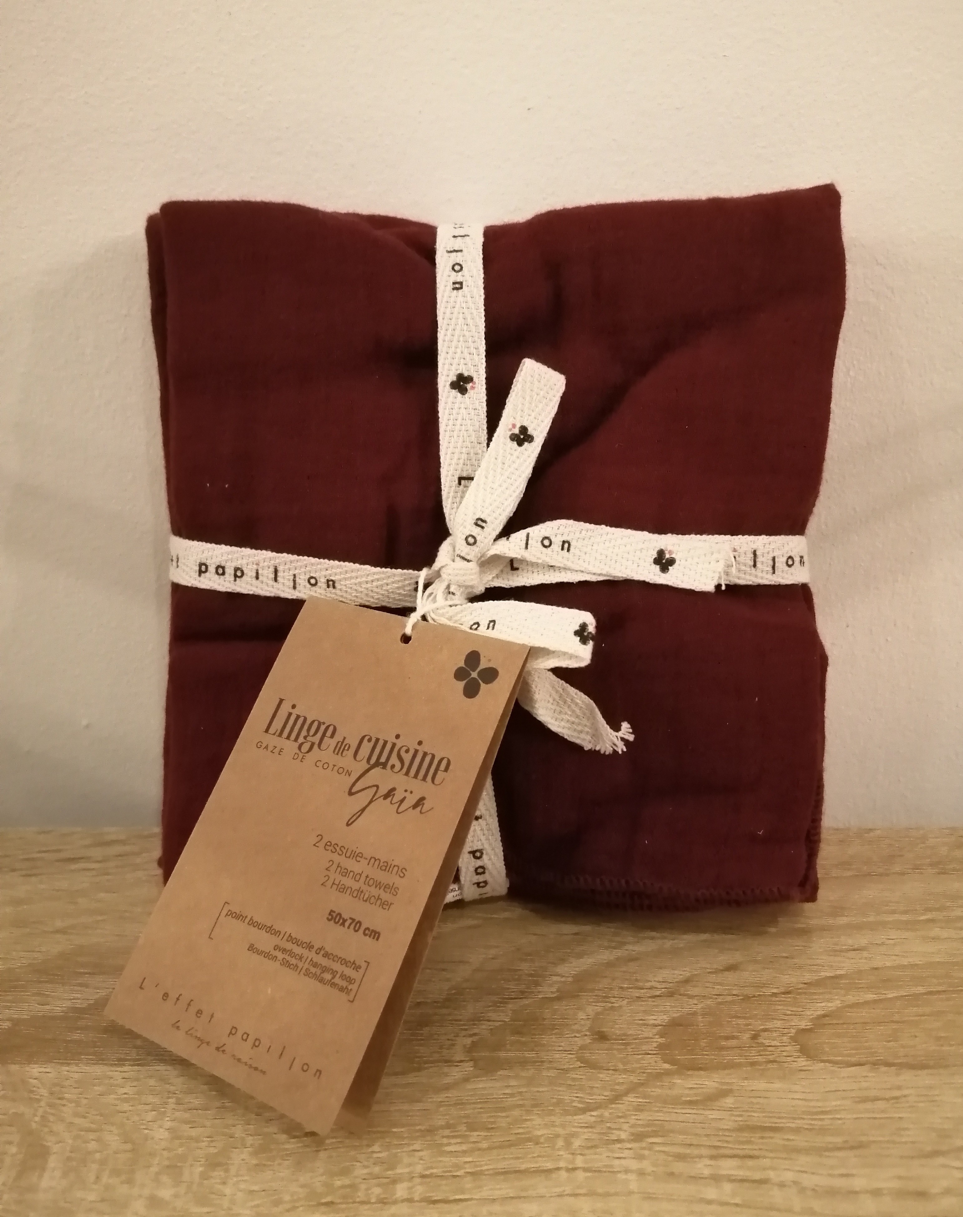 L'effet papillon imagine du linge de maison de qualité, actuel, tout en ayant un partenariat équitable, certifié Oeko tex, réalisé en double gaze de coton indien, tissé en 125g/mm2, ce lot de 2 essuie mains au tissu très agréable et léger apportera une touche tendance à votre cuisine. Modèle Gaia. Dimensions : 50 x 70 cm
