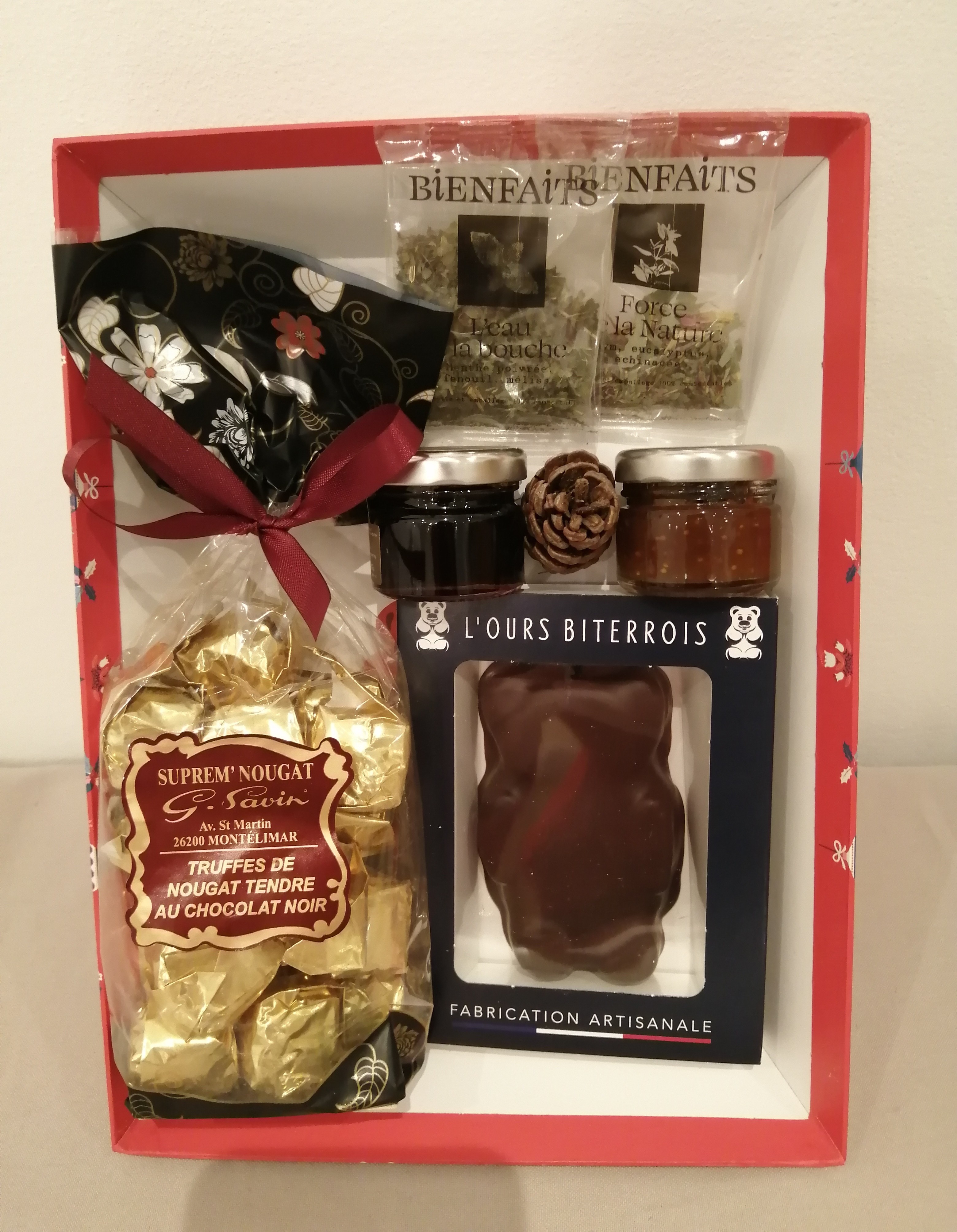 Coffret 6 produits avec 1 sachet de truffes de nougat tendre au chocolat, 1 ourson guimauve chocolat noir, 2 mini confiture, 2 sachets d'infusion bio Bienfaits, dans une corbeille carton rouge décor de Noël.