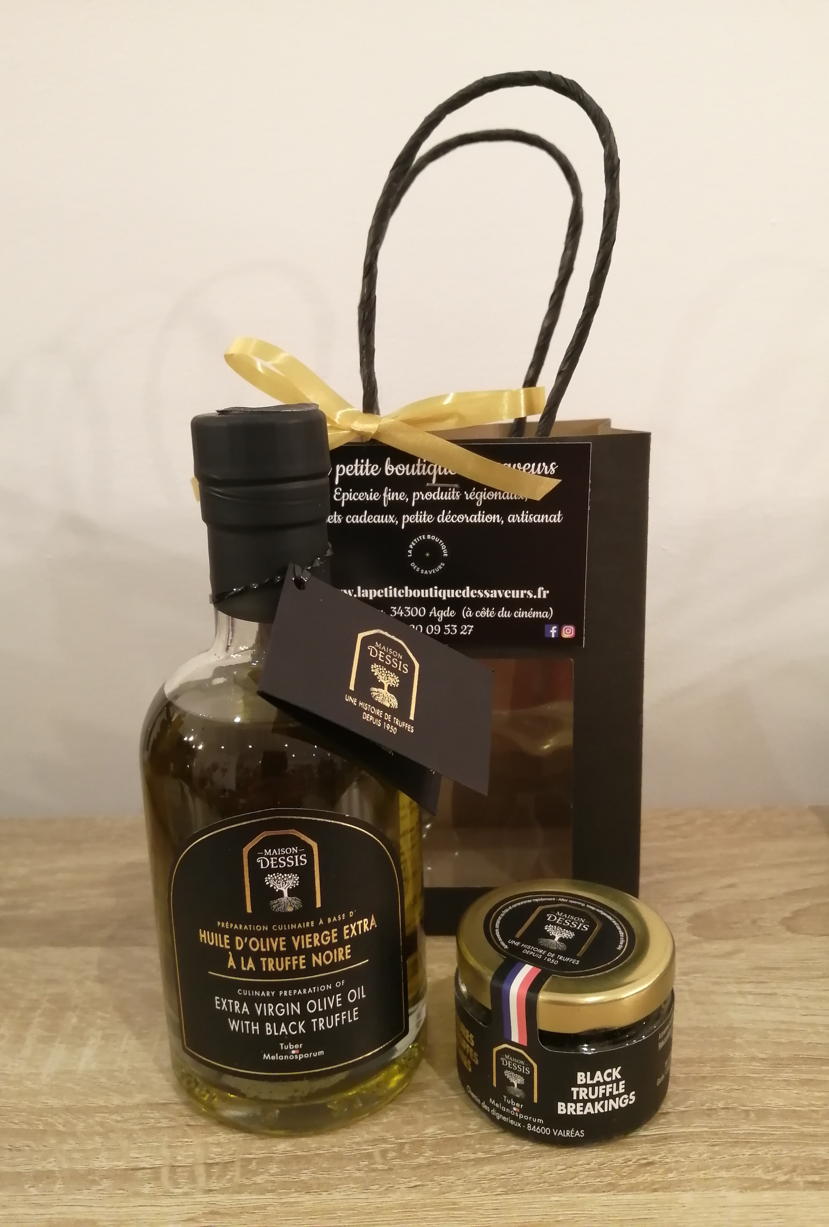Coffret comprenant une huile d'olive bio vierge extra de Provence à la truffes noires et 1 pot de brisures de truffes noires 15g dans un sac cadeau