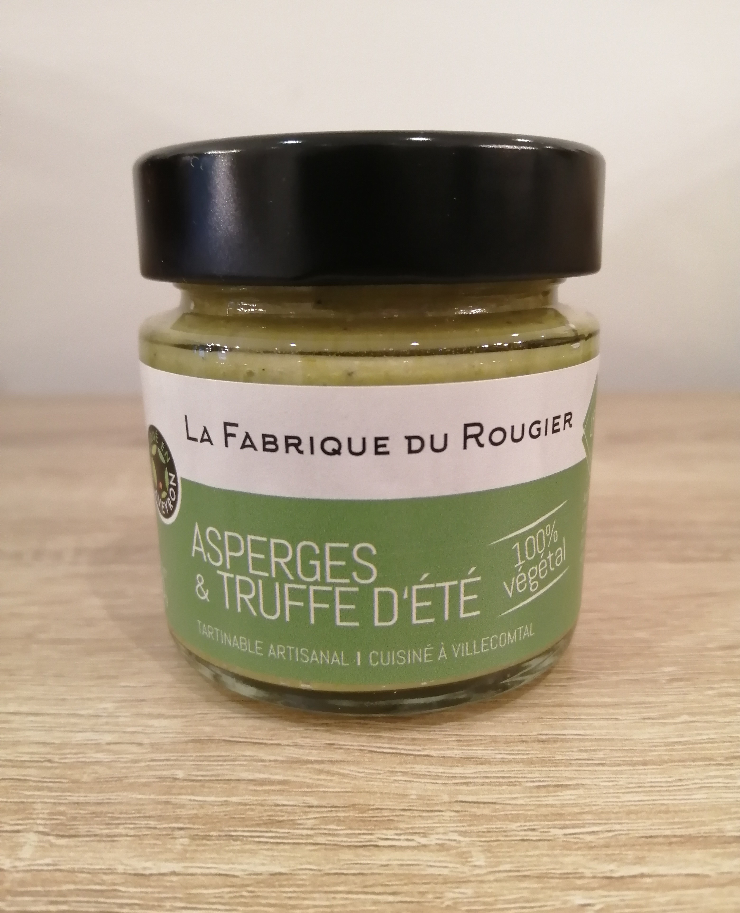 Asperges bio (56 %), pomme de terre, huile d'olive bio, truffe d'été (7 %), jus de truffe, vin blanc, poivre, sel de Guerande.
