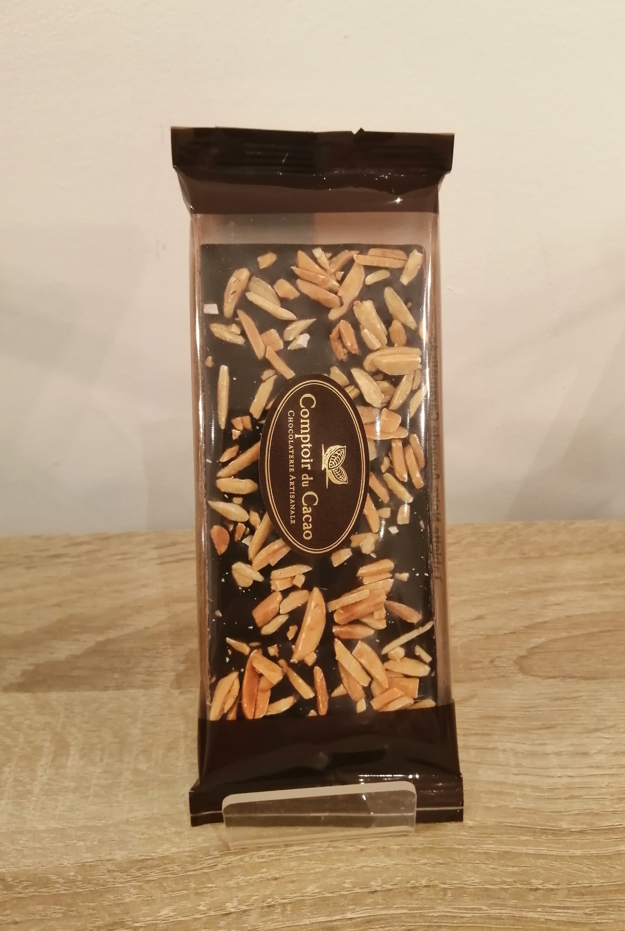Comptoir du cacao chocolaterie familiale artisanale du Loiret propose cette tablette au chocolat noir 70% aux amandes es caramélisées (17 % minimum).