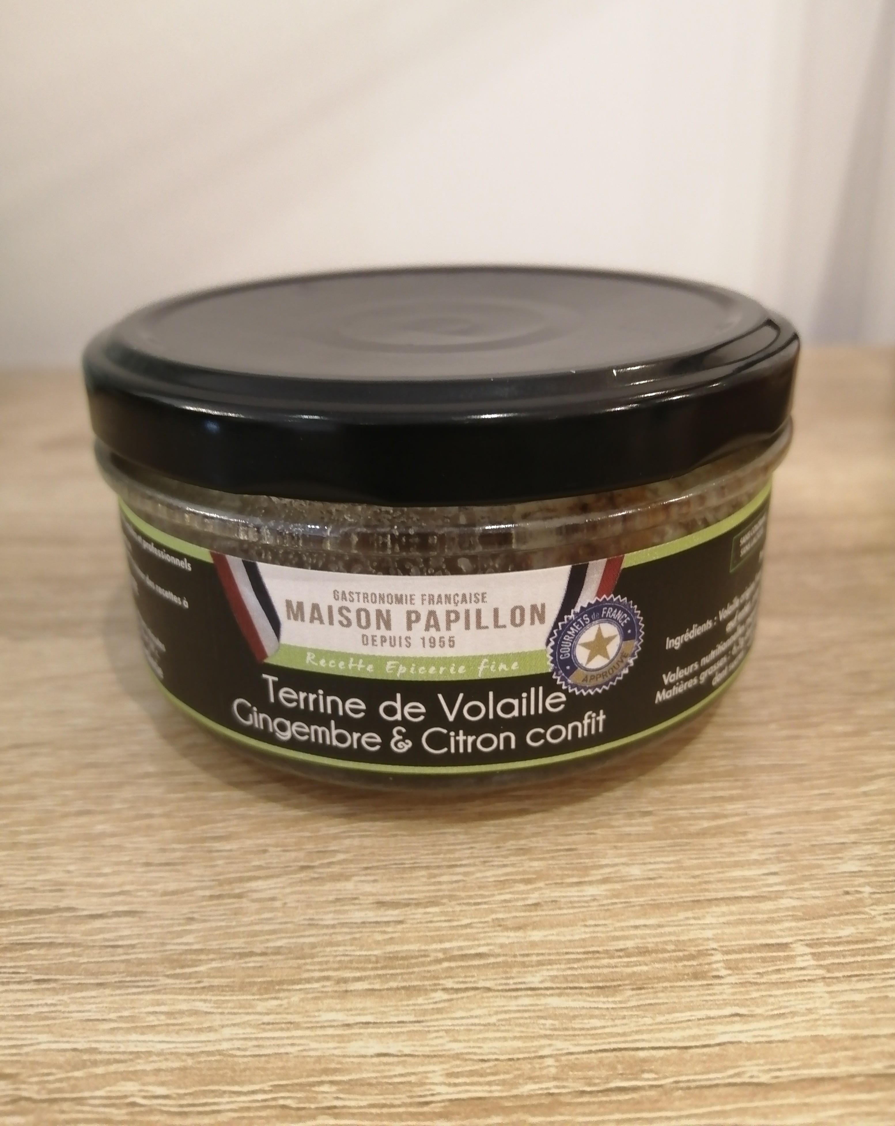 Volaille origine France 93 % (foie, viande, peau), citron confit (3 %), œufs entiers, gingembre 1 %, sel et épices.